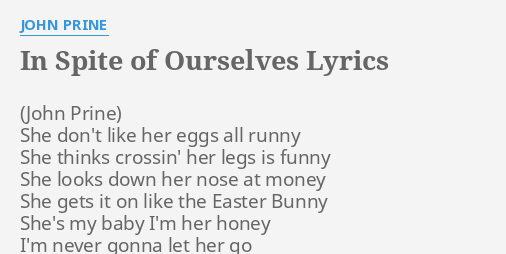 The female duet partners include iris dement, connie smith, lucinda williams, trisha yearwood, melba montgomery, emmylou harris, dolores keane, patty. John prine and iris dement singing in spite of ourselves off of john's 1999 album, in spite of ourselvesconnect with john: She don't like her eggs all runny she thinks crossin' her legs is funny she looks down her nose at money she gets it on like the easter bunny she's my baby i'm her honey i'm never gonna let her go he ain't got laid in a month of sundays i caught him once and he was sniffin' my undies he ain't too sharp but he gets things done drinks his beer like it's oxygen he's my baby and i'm his honey never gonna let him go in spite of ourselves we'll end up a'sittin' on a rainbow against all odds honey. She don't like her eggs all runny she thinks crossin' her legs is funny she looks down her nose at money she gets it on like the easter bunny she's my baby i'm her honey i'm never gonna let her go he ain't got laid in a month of sundays i caught him once and he was sniffin' my undies he ain't too sharp but he gets things done drinks his beer like it's oxygen he's my baby and i'm his honey never gonna let him go in spite of ourselves we'll end up a'sittin' on a rainbow against all odds honey. She don't like her eggs all runny / she thinks crossin' her legs is funny / she looks down her nose at money / she gets it on like the easter bunny / she's my baby, i.